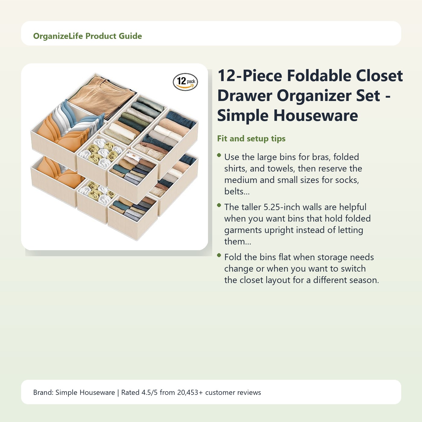 This 12-piece organizer set is made for closets and dressers that need more flexibility than one-size bins can offer. With large, medium, and small fabric boxes in the same pack, you can assign bigger compartments to bras and towels while reserving smaller bins for socks, scarves, and accessories.