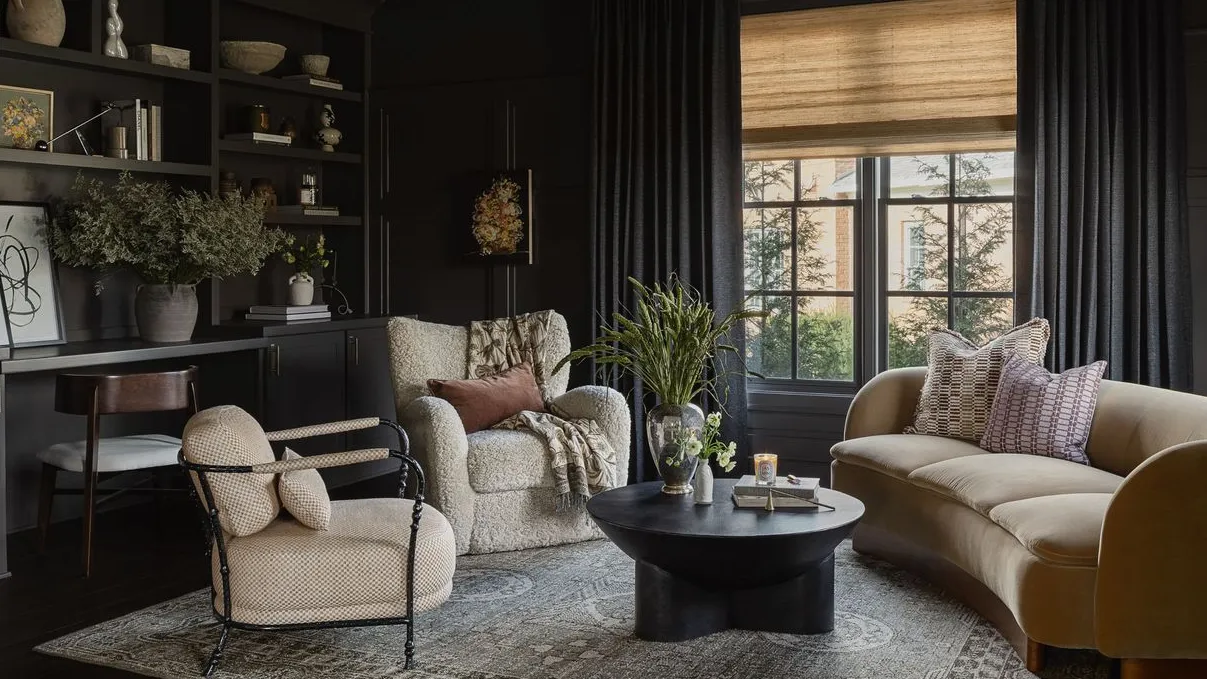 A key example is a snug, charcoal-painted room that functions as both lounge and workspace. Deep wall color wraps the space, creating a cocooning effect. A curved sofa softens the strong lines of the architecture, while two neutral armchairs and a patterned rug keep the room from feeling too austere. A black coffee table grounds the seating area, and a wall of built-in shelving and a desk introduces function without sacrificing style.
