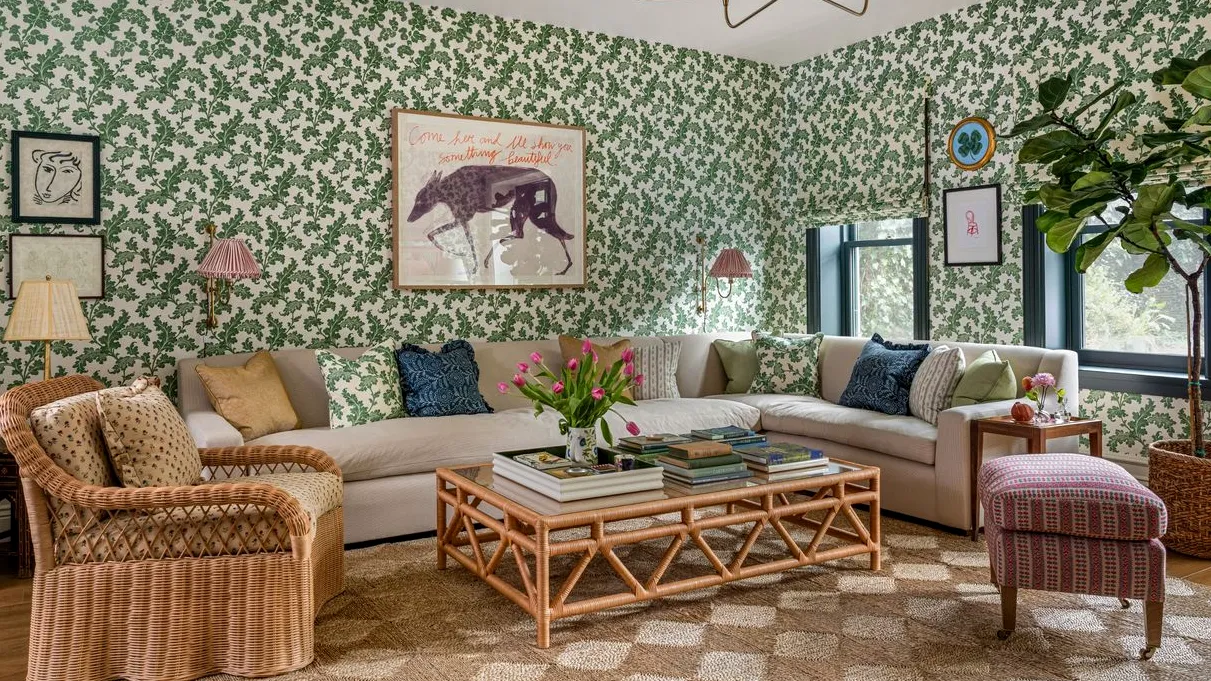 That explains the appeal of a Wes Anderson-adjacent approach to interiors: disciplined whimsy. Not chaos, not clutter, but color with intention. In practical terms, this means pairing patterned wallpaper with grounded upholstery, or using a strong rug to anchor eclectic furniture so the room still feels edited. If you love the look but worry your space will read crowded, use the designer’s trick hiding in plain sight: repeat one color family at least three times across the room. A green floral wall, olive trim, and a sage throw create continuity. A red lamp, rust piping, and a terracotta accent do the same. Repetition turns “busy” into “collected.”